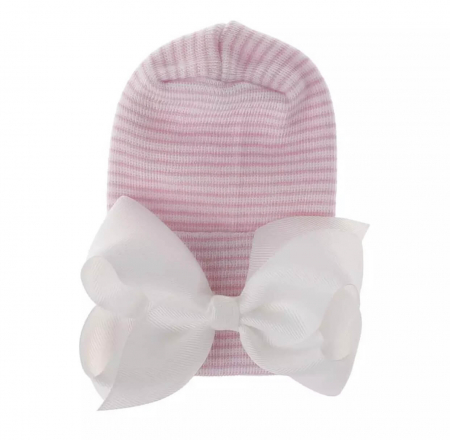 7. Newborn muts roze gestreept met witte strik van lint extra warm